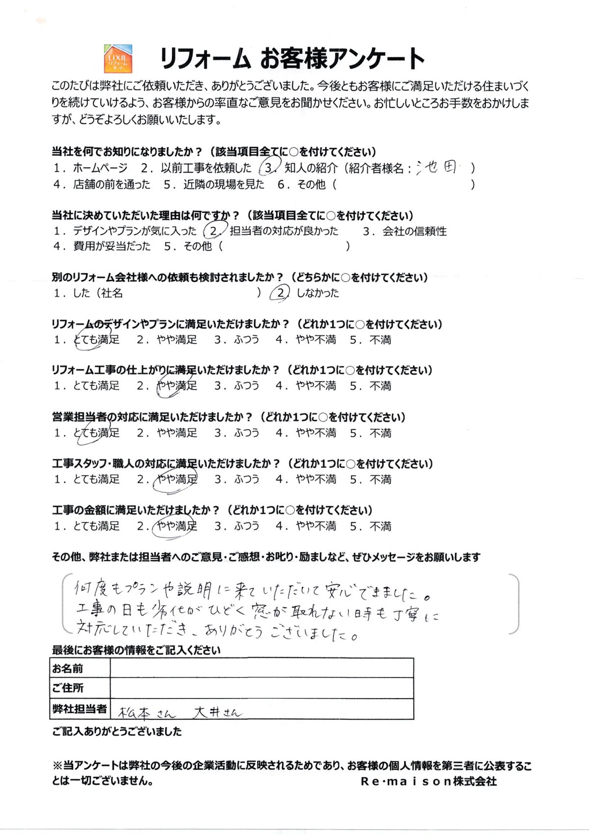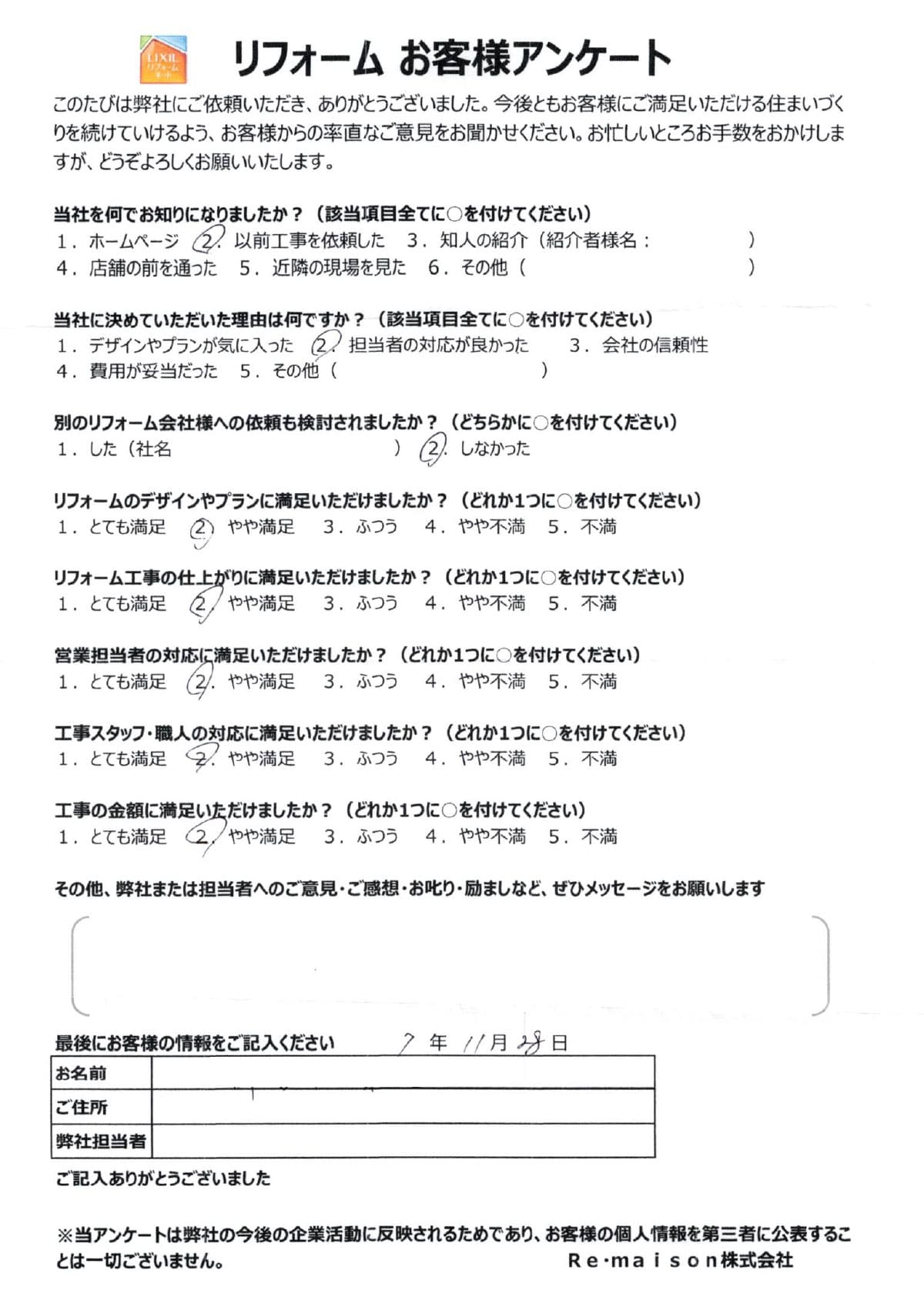 いつも細やかな心配りで、安心してお話しでき、ご相談に乗っていただいてとてもありがたいです。予算が潤沢にあれば、壁の漆喰や介護のためのろう下のリフォームなど、本当はいろいろとやりたいところですが、これはまたの機会に今後ともよろしくお願いします。